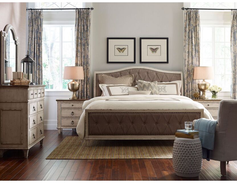 Reminiscent of a cottage in the European countryside, the Southbury furniture collection is both charming and elegant. Its inspiration comes from the gracefully aged painted antiques of a previous era. The personality of Southbury with oak veneers is captured in the finish where handwork and an artistic eye create the Parchment finish on the fronts and end panels while the tops are treated to a contrasting fossil tone finish. Design elements from French and Italian influences not only add character, they also make the furniture right at home in both traditional and casual bedroom, dining room, or living room spaces.