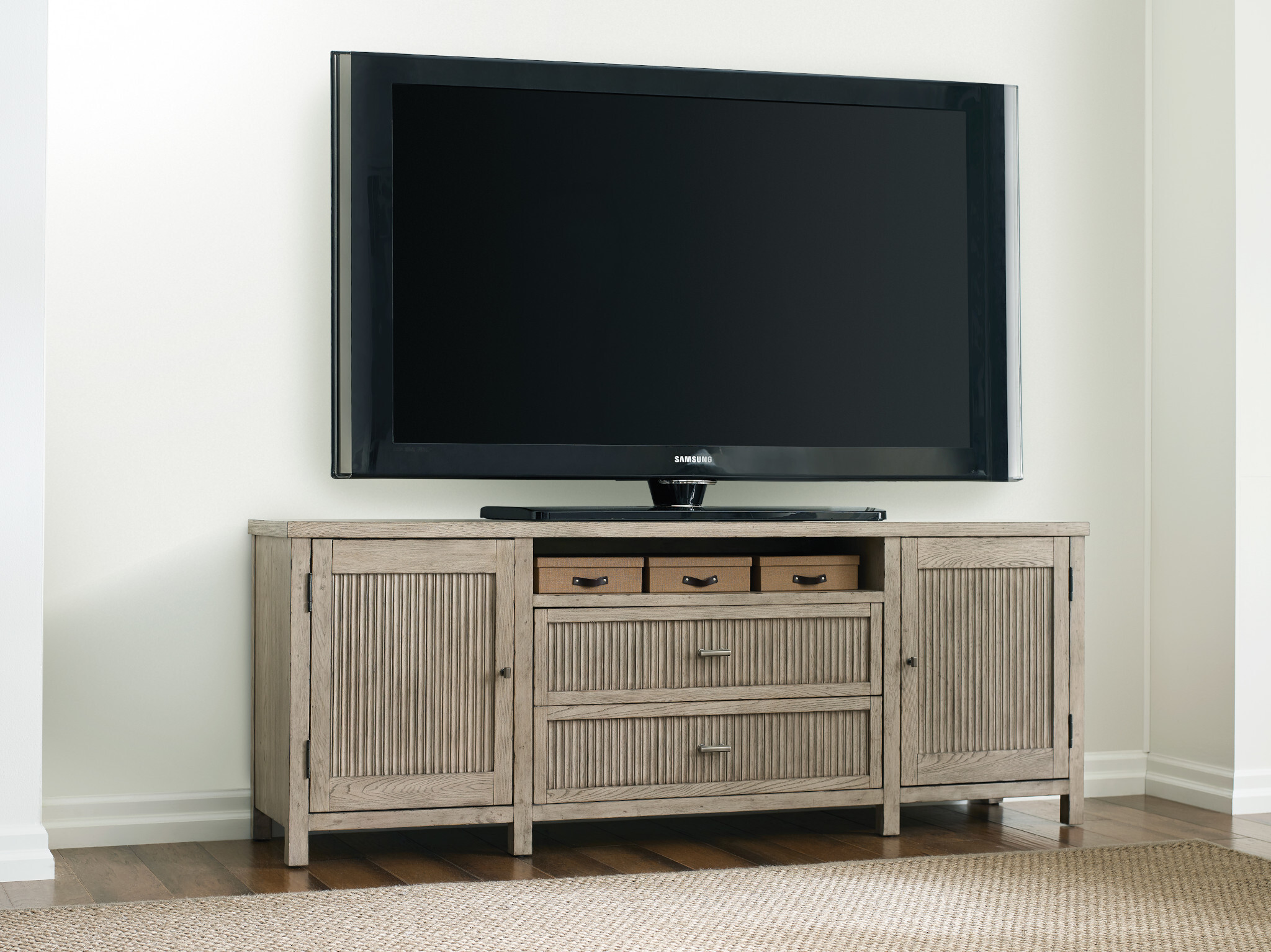 Merit Media Cabinet is beautifully designed with textured drawer and door fronts. Two drawers and center open compartment for media storage. Two doors with one adjustable shelf behind each, adjustable levelers, cord exits and electrical outlet behind left side door.